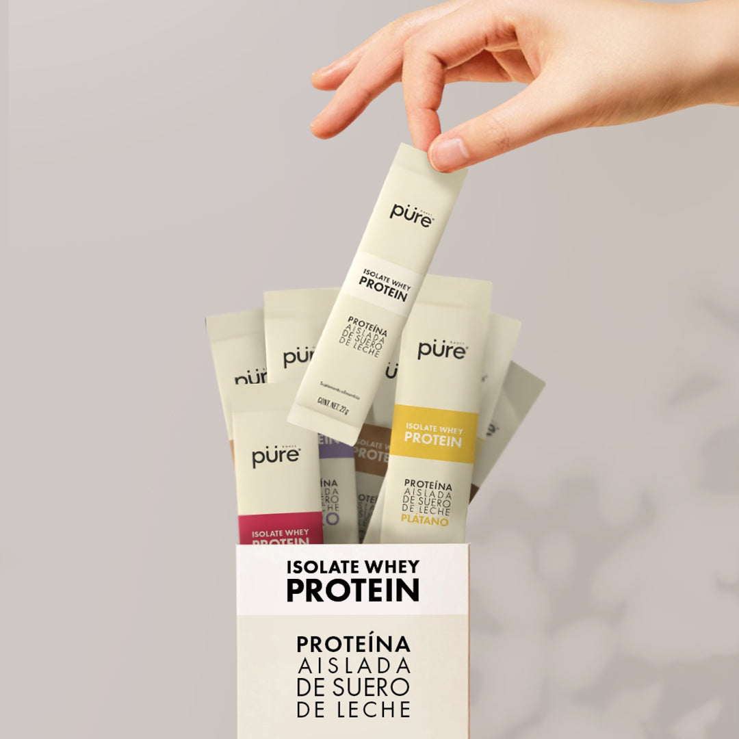 Cada stick tiene 22 gramos de proteína aislada de suero de leche sabor plátano. La forma más concentrada que existe con un aminograma completo: menos lactosa, menos grasa, más proteína por gramo. Solo dos ingredientes.